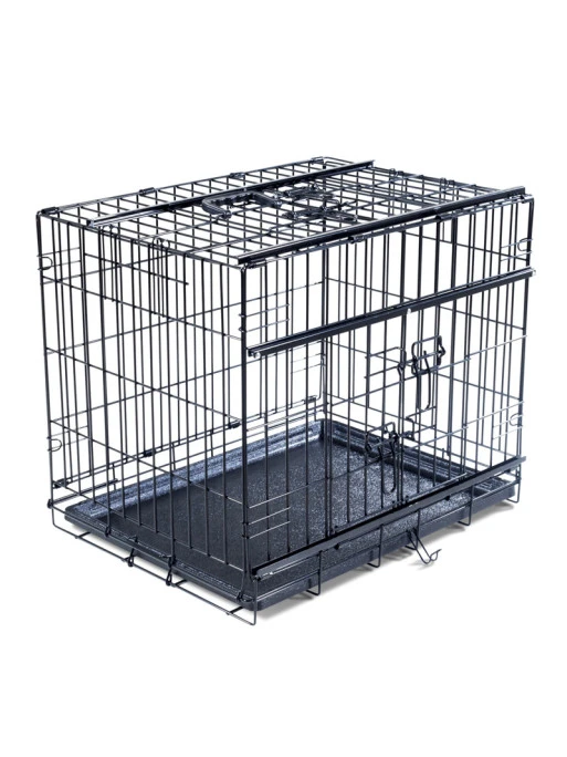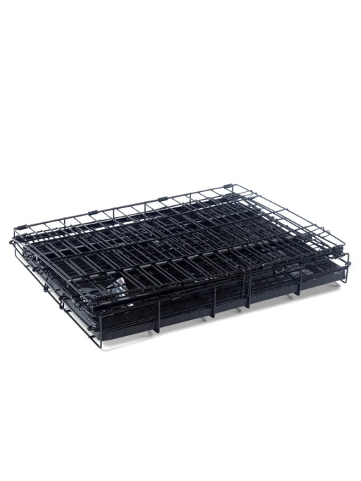 Cette cage pliable est munie de 2 portes d’accès coulissantes, l’un latérale et l’autre est située sur le haut de la cage, chacune équipé d’un loquet.