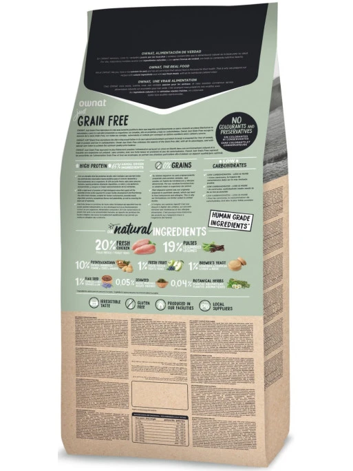 Les croquettes Just Grain Free Adult Chicken Ownat sont préparées avec 20% de viande fraîche de poulet minimum, ce qui en fait un aliment complet, très appréciées des chiens grâce à sa grande appétence.